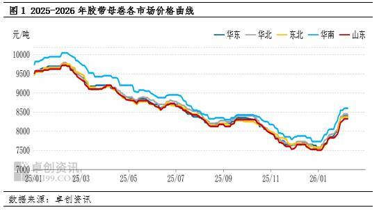 2026年中国胶带母卷市场价格在原材料上涨与刚性需求增加的双重支撑下显著上行,截至2月9日各区域均迎来不同幅度上涨:华东市场涨至8300-8500元/吨,华北市场涨至8400-8500元/吨,华南市场涨至8500-8700元/吨,三地均较2025年12月底上涨825元/吨;山东市场涨800元/吨至 8250-8400元/吨,东北市场涨775元/吨至8300-8450元/吨。虽然价格均出现不同幅度上行,但受订单以及原料供应差异影响,各区域停机进入假期时间有差异。